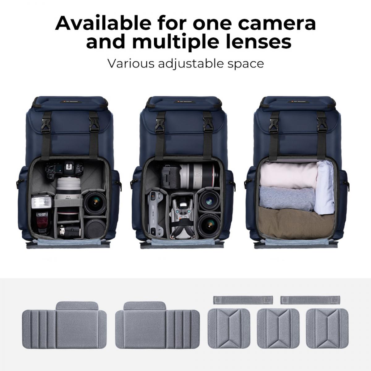 As a professional outdoor camera bag, the capacity is 25L, the upper and lower storage compartments, one camera with multiple lenses, front opening.