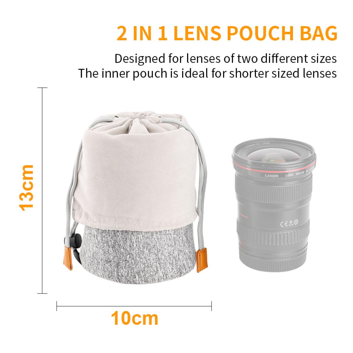 • * 【2-in-1 Drawstring Design】 Independent drawstring design for inner and extended pockets,, makes it easy and convenient to access. Folded Inner pocket of 10*13cm for short lens and extended one of 10*18cm for long lens, two storage sizes in one pouch.
