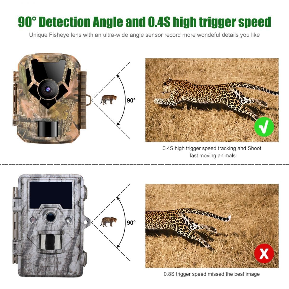 • 【Fast Trigger Speed & Long Working Time】Our trail camera features an impressive trigger speed of 0.4 second, which allows it to record every exciting moment of the detecting places. Besides, the camera has an incredible-long standby time of up to 3 months when powered by 4 AA batteries and even longer when connecting to the solar pane(Not included).