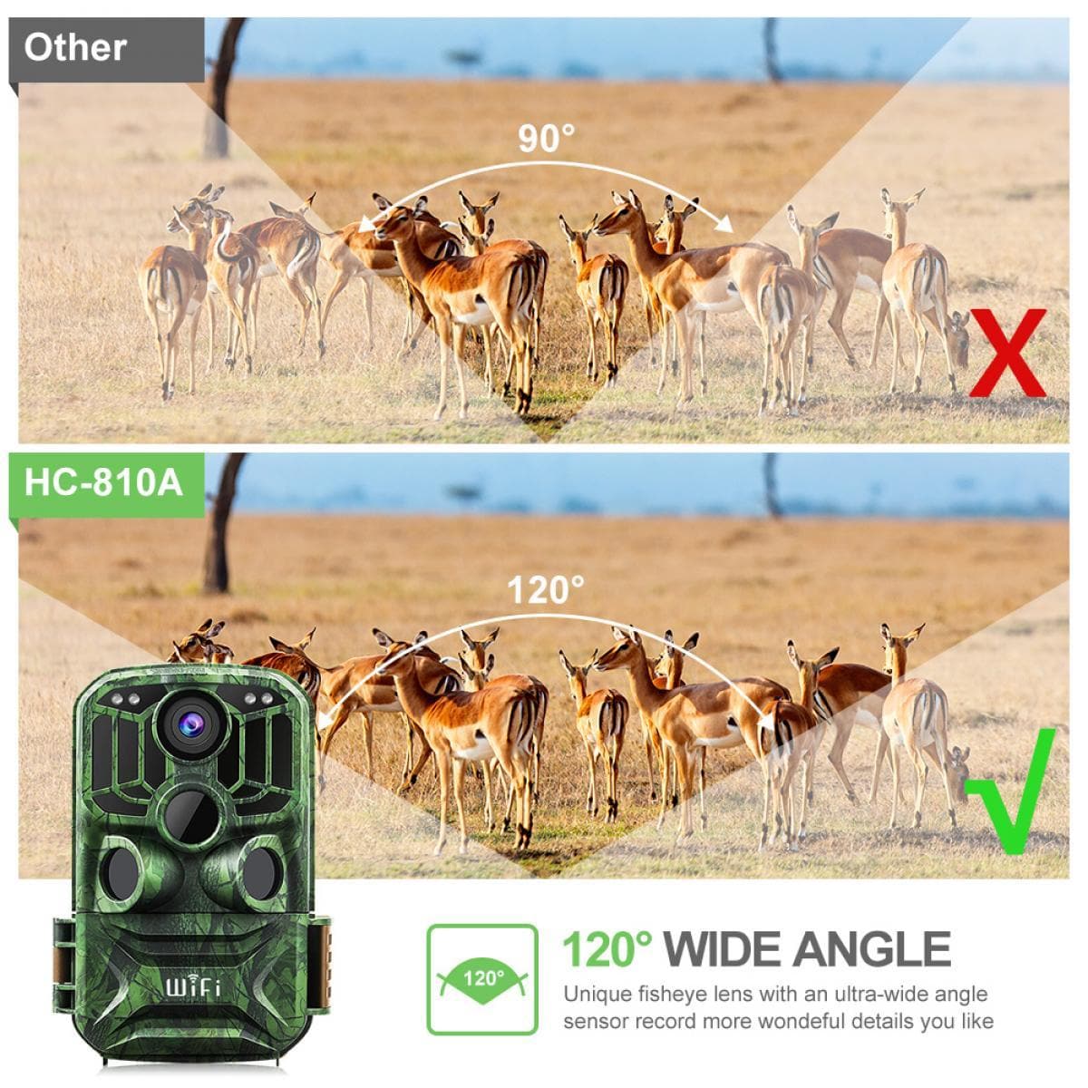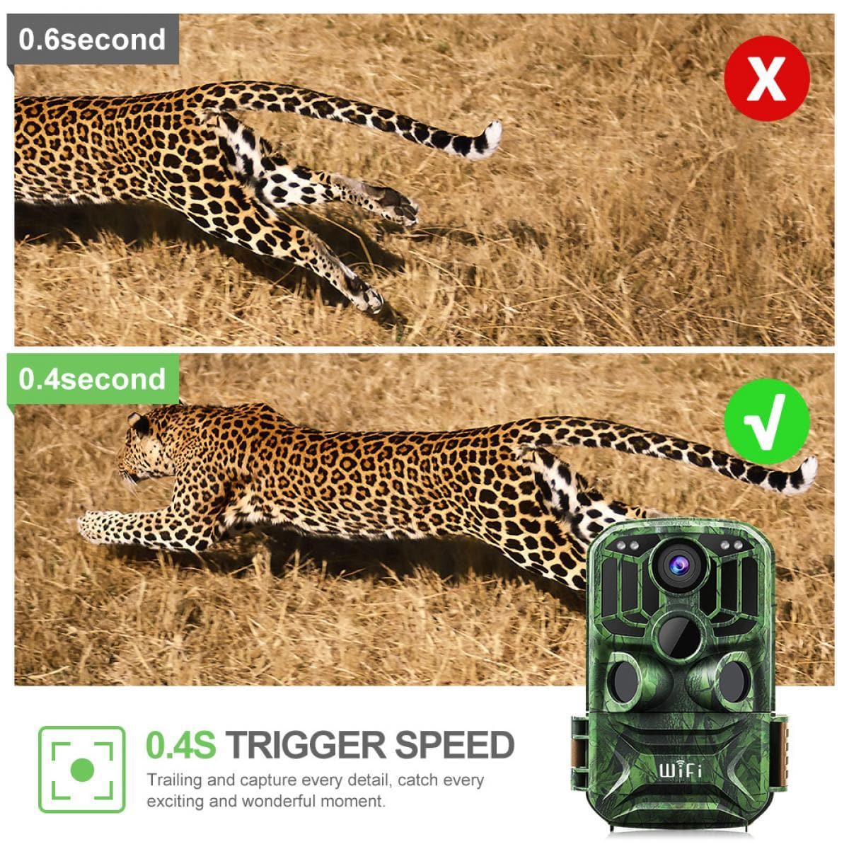 • 【IP65 Waterproof & Sturdy】With IP65 waterproof, the sturdy case extremely protects trail camera from rain and dust damage. The camera can work well even in tough environments, such as desert, grassland and tropical rainforest.