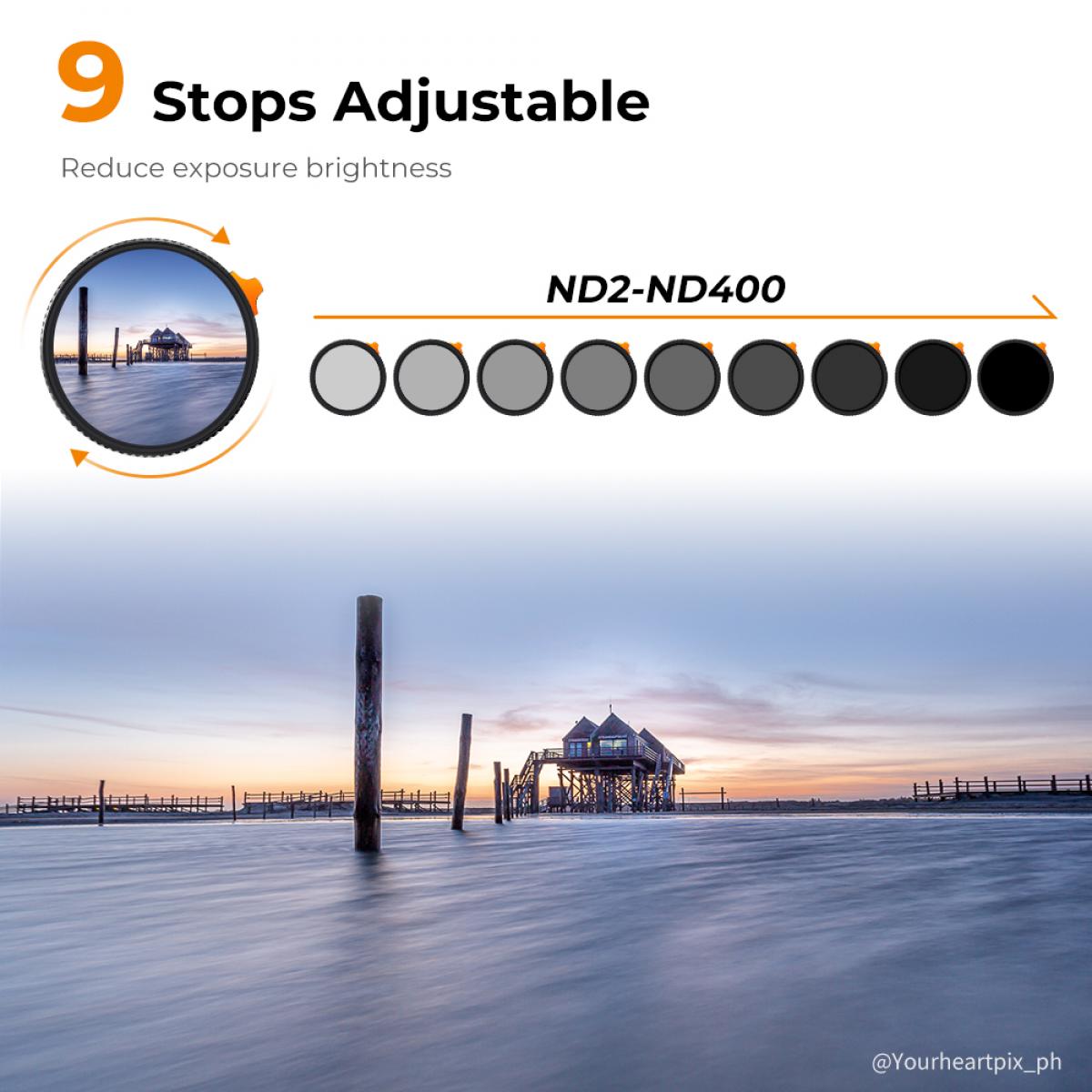 Putter Design to Adjust 9 Stops - Designed with a putter, K&F Concept variable ND filter can be adjusted by 9 stops from ND2 to ND400. Each stop is marked on frame conveniently for 360° rotated to adjust the stop, multi-scene application