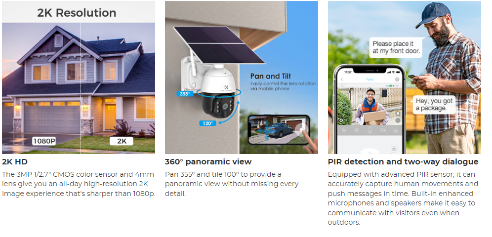 • * 【2K HD Video & Color Night Vision】This solar security camera provides excellent night vision up to 12 meters through 6 infrared LEDs. Enjoy colorful night vision even on dark nights and light your way home with bright LED spotlights, this PTZ camera supports 355° pan, 100° tilt and 4x zoom for 360° coverage and allows you to view any corner you want to monitor.