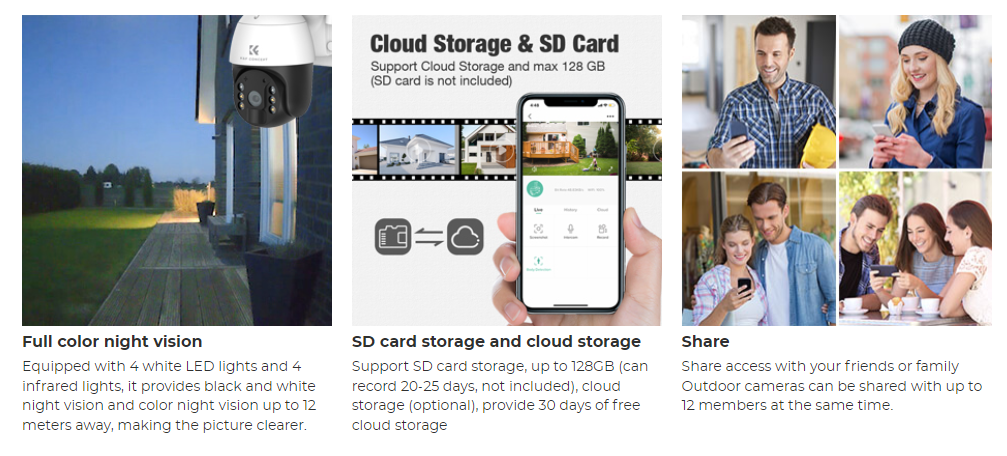 • * 【Multi-User Viewing and Sharing】If you want to build your own security system, just install security cameras in your garage, farm, backyard, store, office, etc. Anywhere, you can easily manage all of them with just one phone via UBOX app. To let your family join in better home security management, this surveillance camera can share the live recording and operation rights to up to 12 users.